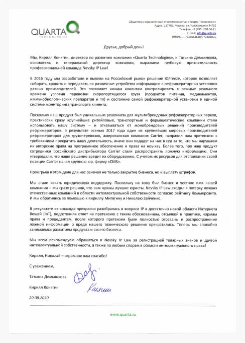 Хотел бы сказать слова благодарности Кириллу Митягину, за то, что еще 6 лет назад, мы оформили многочисленные свидетельства на товарный знак и патент, которые уже в первый год помогли нам отстоять свои права.