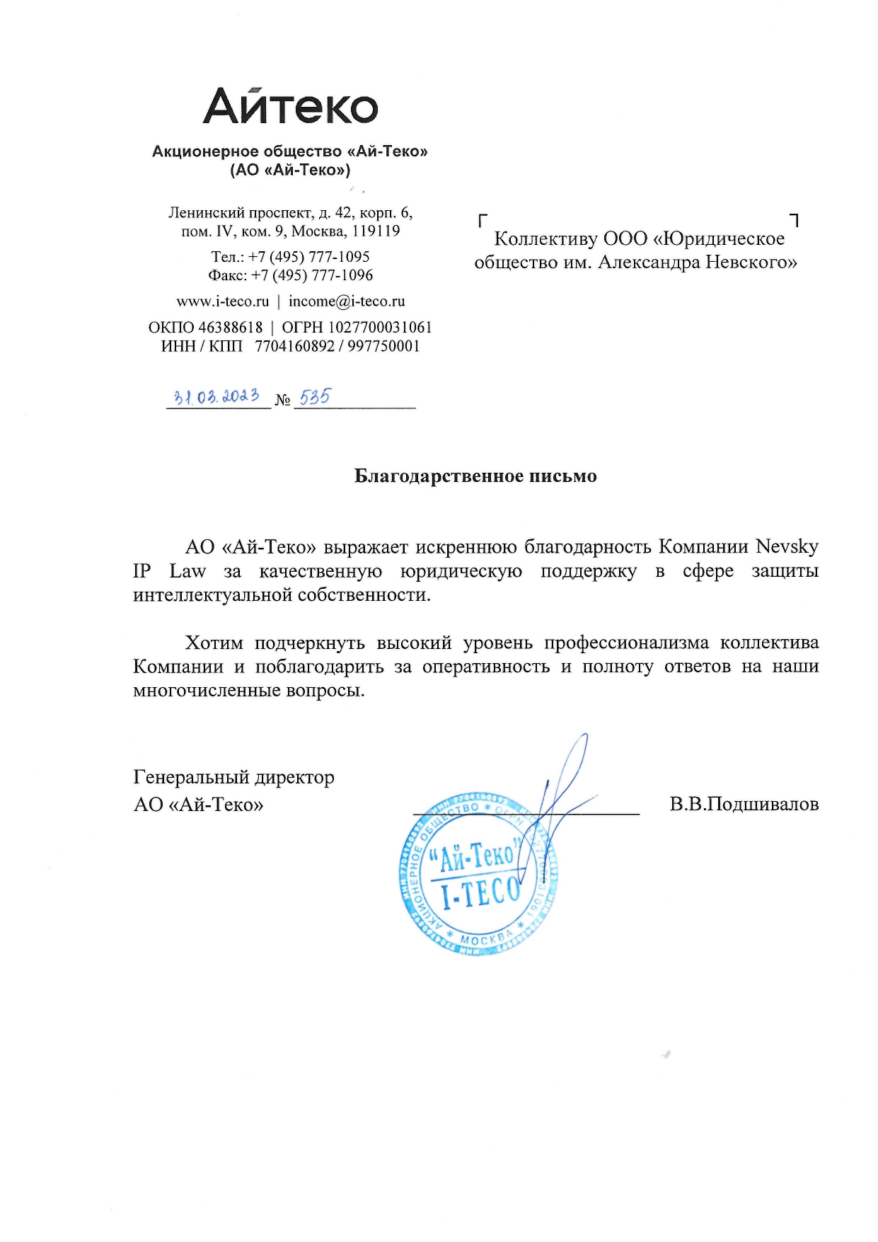 Благодарственные письма от наших клиентов